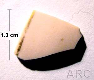 Pezzo di terraglia spesso 3 mm. Forse parte di una brocca. Cliccare sulla foto per ingrandire. |