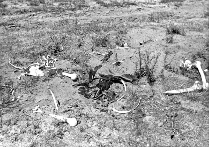 The photo was taken in 1945. Holes and remnants of human bones, unearthed in course of the period when people searched for gold and valuables. Click on photo for enlargement. |